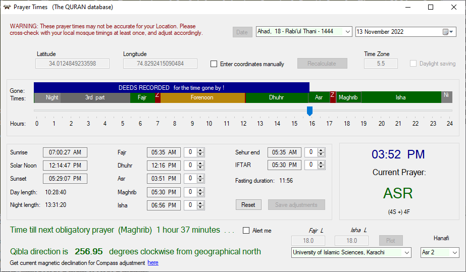 - Includes an innovative full 24-hour Prayer times chart with prayer alert, zawal, midnight, 3rd part of night, Sehur end, and Iftar times; Qibla direction; Hijri dates conversion; Zakat calculator; a simple-to-follow ‘Revive a Sunnah’ list, the Millennium Biography, and the Farewell Sermon.