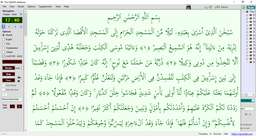 - The Quran database for Windows is a resource for the study, analysis, reference, recitation, and memorization of the Holy Quran.